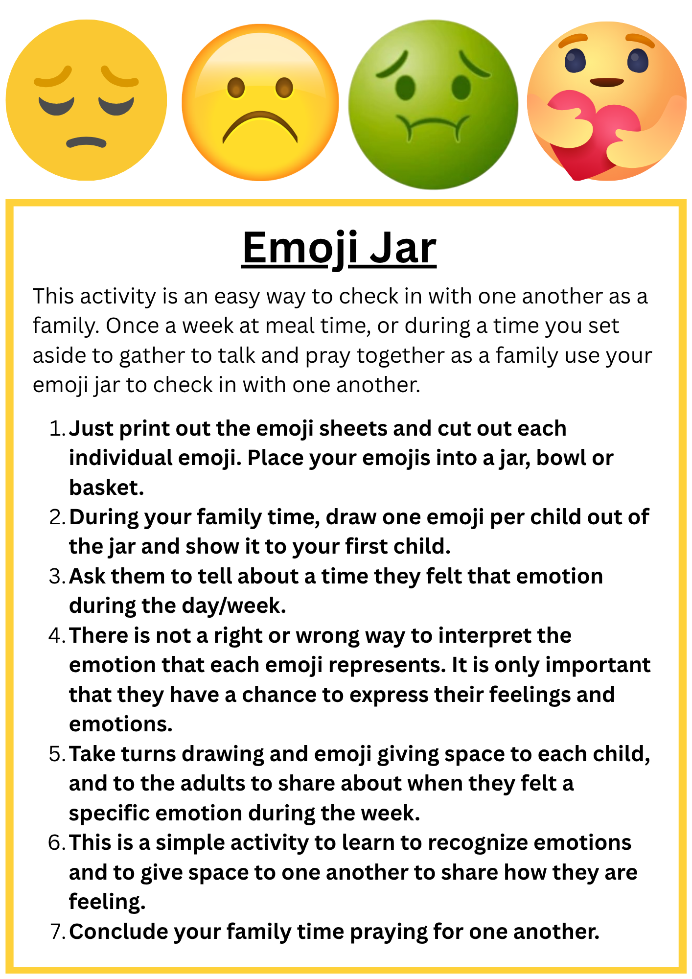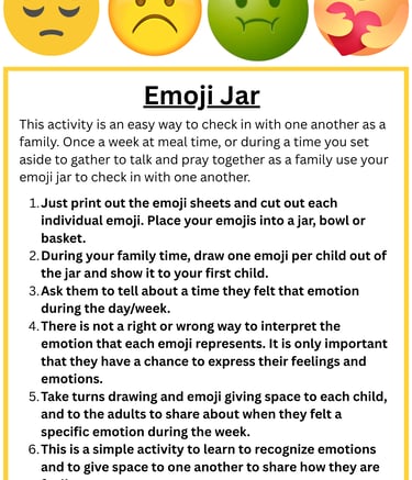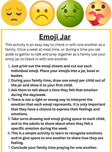 This activity is an easy way to check in with one another as a family. Once a week at meal time, or during a time you set aside to gather to talk and pray together as a family use your emoji jar to check in with one another.