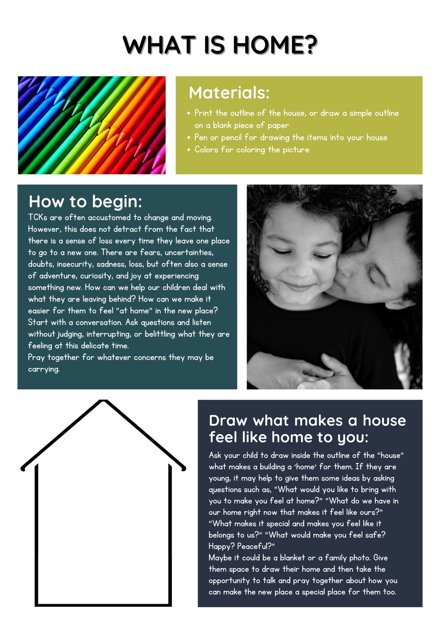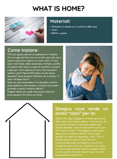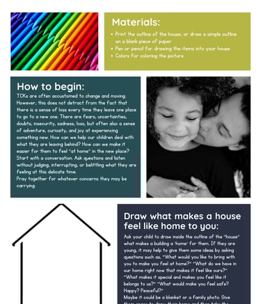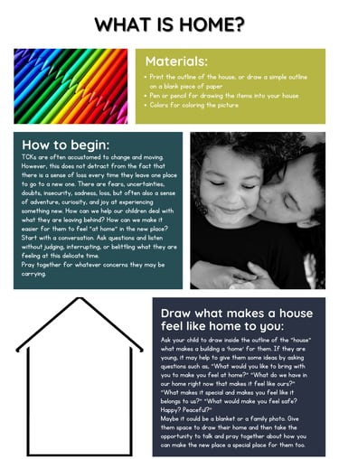 How can we help our children process what they are leaving behind and find healthy ways to make a new place feel more like home to them? Use this activity to spark conversation and help them talk about their needs.