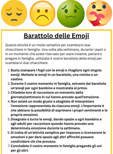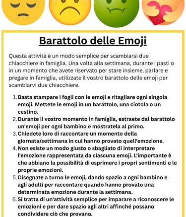 Questa attività è un modo semplice per fare un check-in come famiglia. Una volta alla settimana, durante un momento che avete riservato per stare insieme utilizzate il vostro barattolo delle emoji per scambiarvi due chiacchiere.